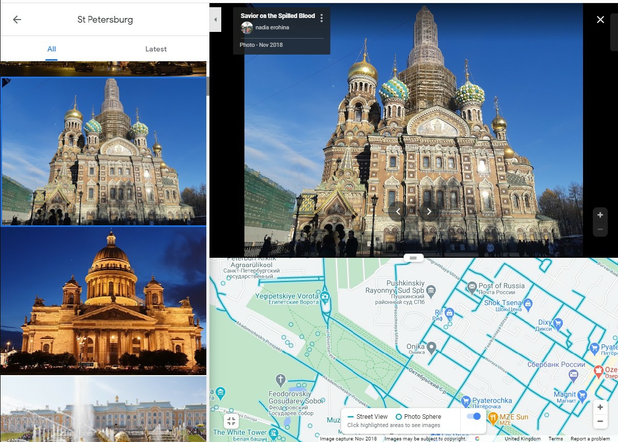 I’m choosing St Petersburg in Russia as it’s opulent, far away and somewhere we are not likely to be going this week!! As my Russian language is nonexistent and I don’t know where things are or what is worth looking at I start by choosing the city, county in the search box. This gives me the weather & local time, photos and some Quick Facts and hotels in the left pane and a street map view in the right. I clicked on the photos to give me a quick idea of what to look at and immediately in the right pane is the enlarged photo and in the bottom left corner is the pegman pointing/standing in an area. Hovering over him enlarges the view and turns it to street view. In the bottom left of that image is an enlarge button which will put the map under the photo. Zoom in to enlarge the view. Move the pegman as desired. Many of the buildings can be ‘entered’ and enable a ‘walk around’ with 360 rotation. Click on the floor circles to proceed. Zooming out from the street view photo 360 provides a satellite or overhead view of the area. You may need to copy the photo title and put it in the search box to help navigation.