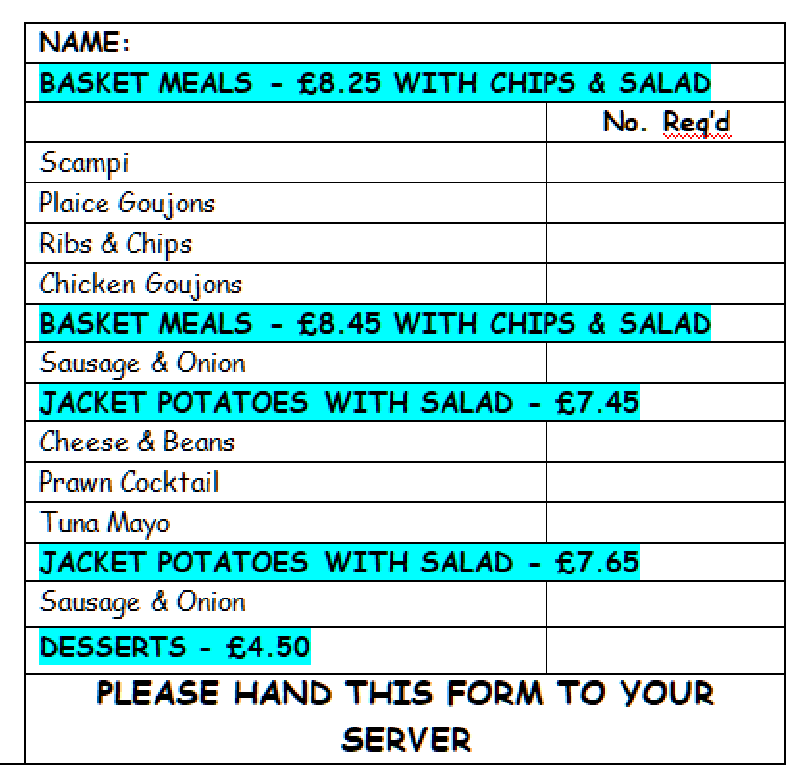 5 Our basket menu is used mainly for functions as advertised such as Saturday quiz nights, Sunday music and Bank Holiday Monday music .etc.